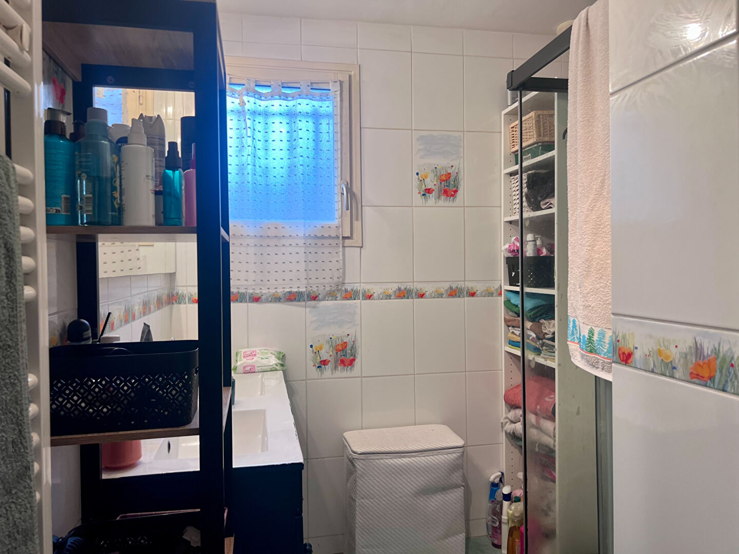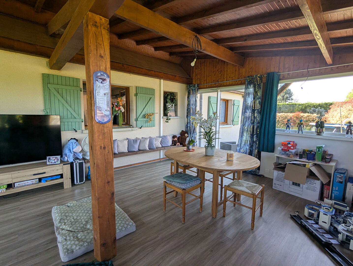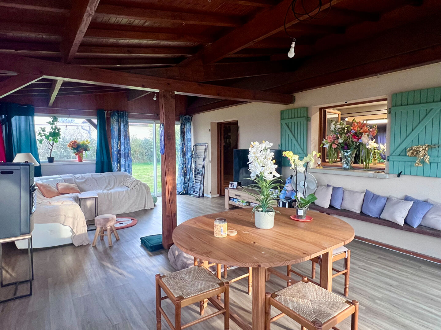Huisseries bois double vitrage alu et pvc pour la véranda, volets roulants électriques et battants bois, climatisation réversible et poêle à bois.