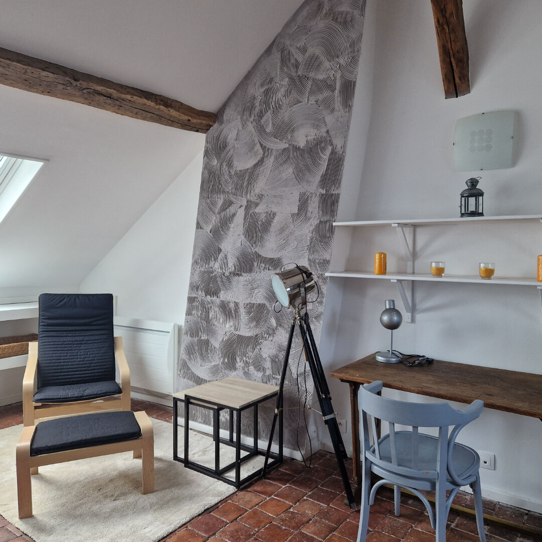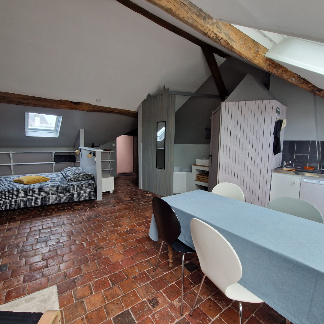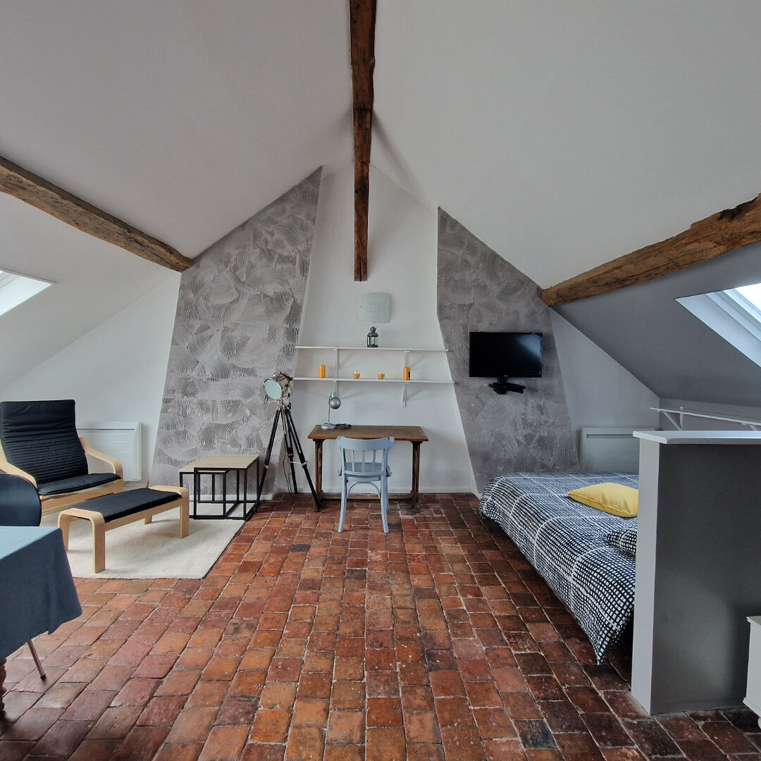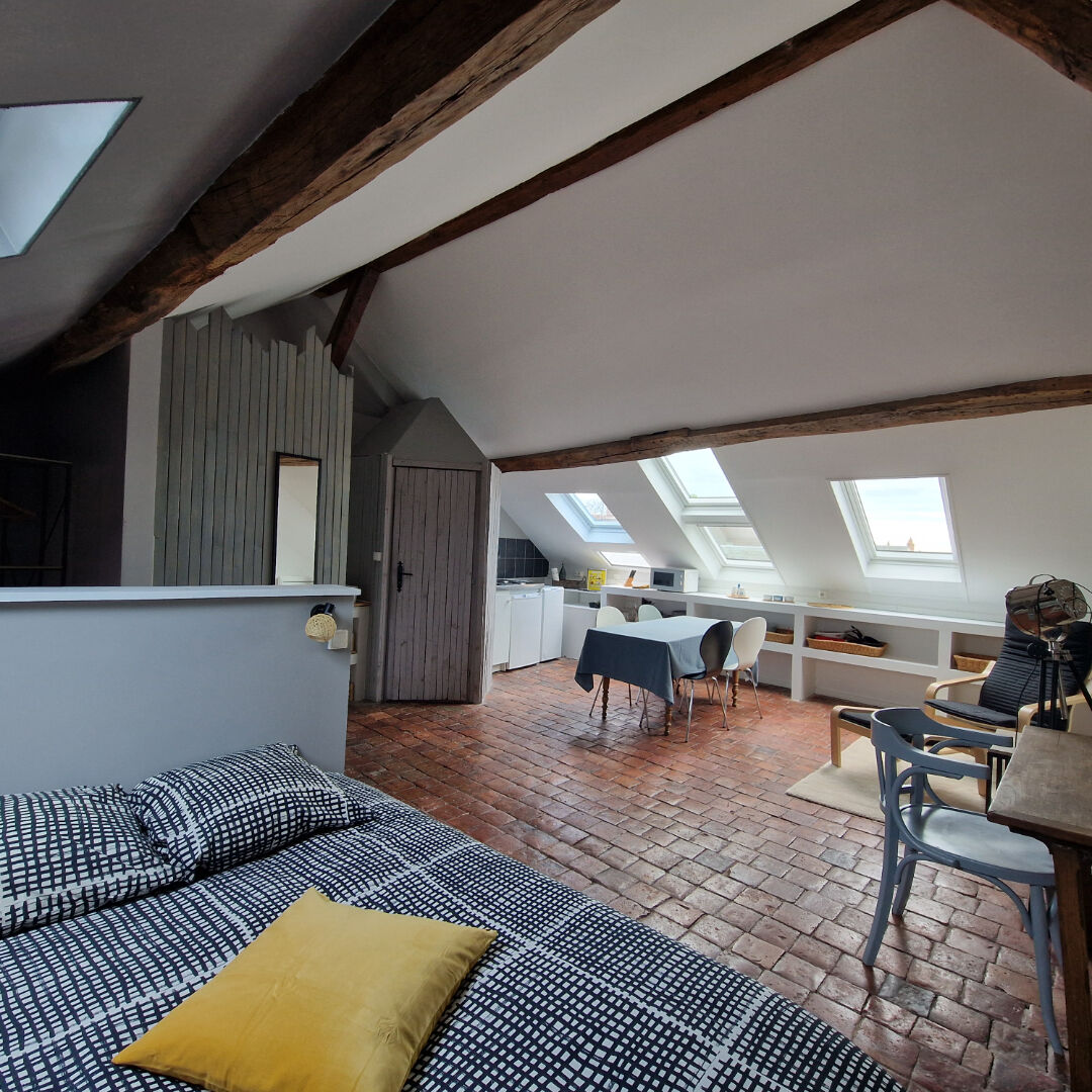 Grand studio meublé avec goût, comprenant pièce à vivre avec coin chambre, cuisine aménagée et équipée (plaques de cuisson, réfrigérateur, machine à laver, vaisselle), salle de bains, wc.